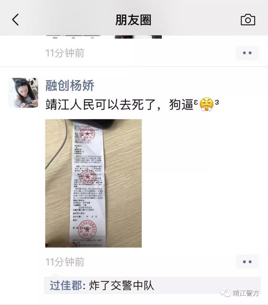 据靖江警方微博,4月2日14时许,“融创杨娇”因被交警查处,为发泄不满,遂在微信朋友圈发布辱骂言论,并有多名网友跟帖。后该截图被多个朋友圈转发,造成恶劣影响。