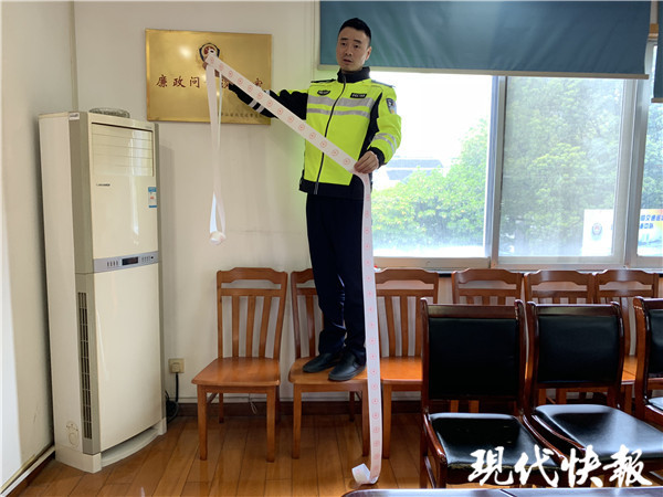 近日,苏州园区交警处理了一起交通事故。这起事故车损虽不大,也没有造成人员伤亡,但由于事故牵涉到的车辆众多,导致一般几十个字就能叙述清楚的事故认定书,这次却打出来足足四米多长。办案交警在现场开具认定书时,甚至还需要旁人搭把手才行,堪称“史上最长事故认定书”。