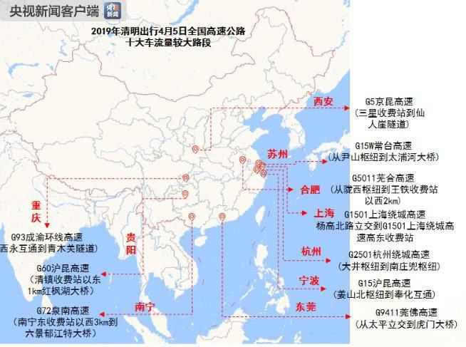 2019年清明出程4月5日全国高速公路十大车流量较大路段