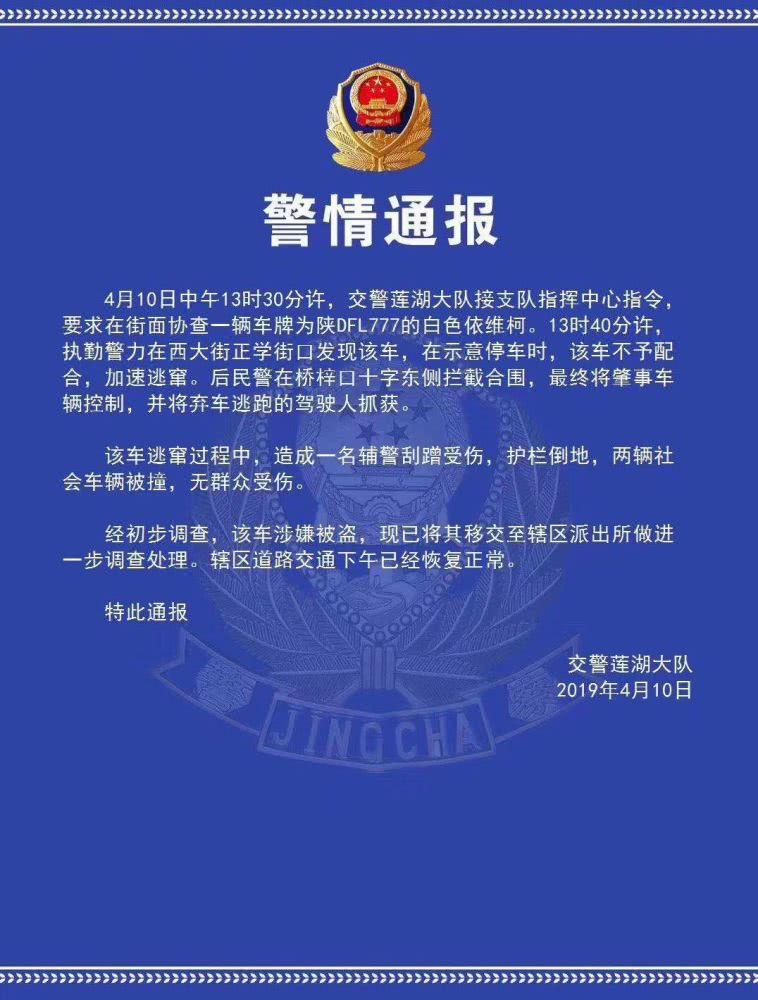 4月10日中午13时30分许,交警莲湖大队接支队指挥中心指令,要求在街面协查一辆车牌为陕DFL777的白色依维柯。
