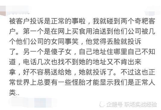 他直言被客户投诉是正常的事啦!第一位奇葩客户就是如此,在网上买食用油,好心送到他们公司,被几个他们公司的女同事笑,他觉得丢脸就投诉了。