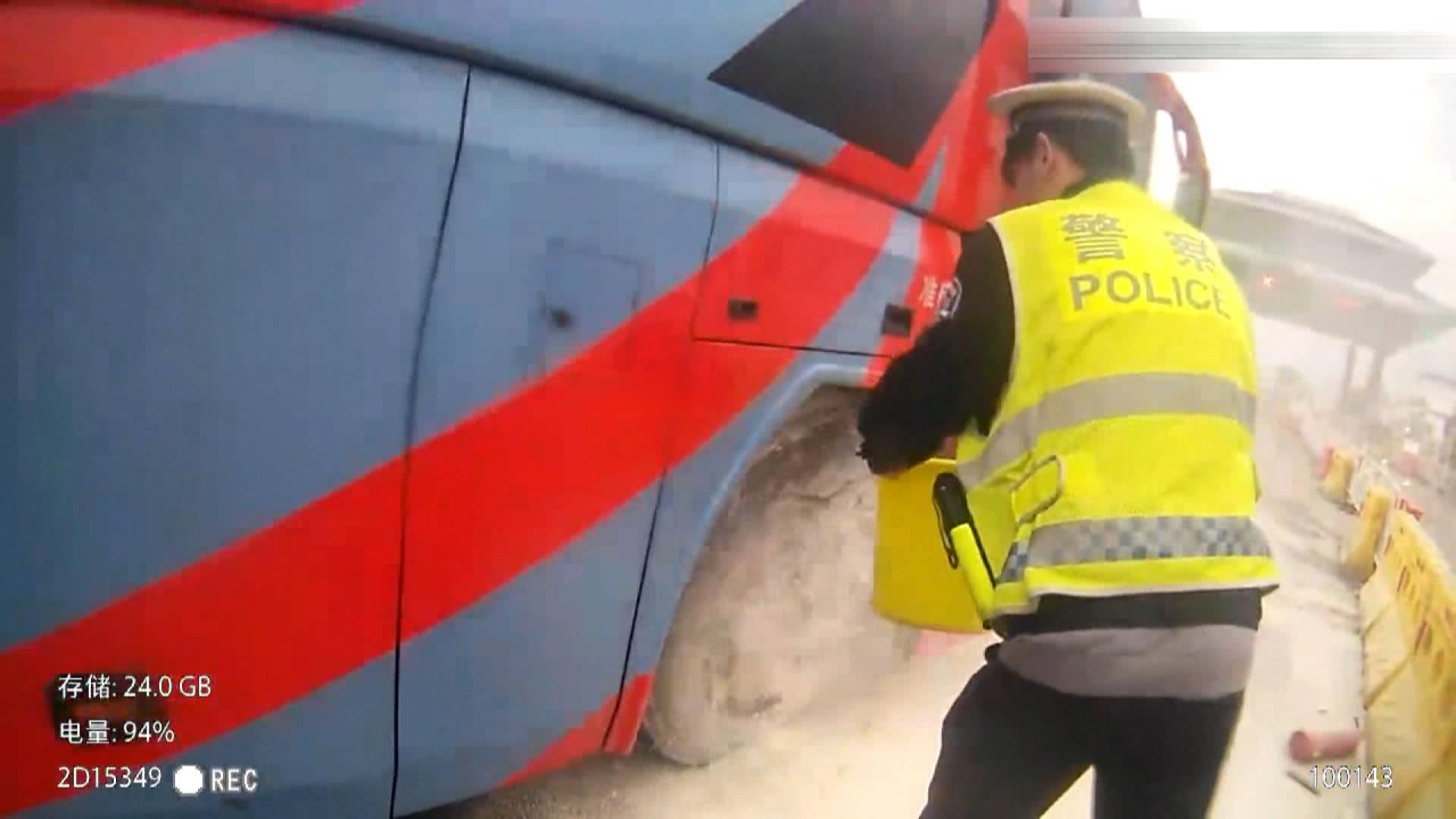 民警立即上前拦停客车,一边在车内取出灭火器对车轮灭火;一边引导疏散司乘人员转移至安全区域。现场收费站工作人员疏散其他车辆,设置警戒区域。