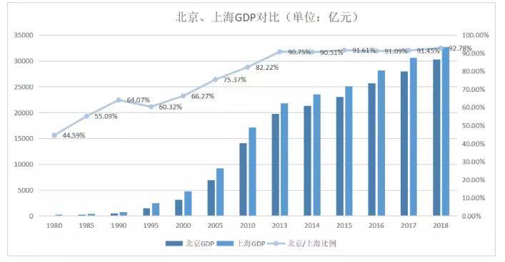 经历40年的奋斗,北京的GDP大有赶超上海之势头。然而,就在这个关键的时刻,北京的追赶运动戛然而止了。