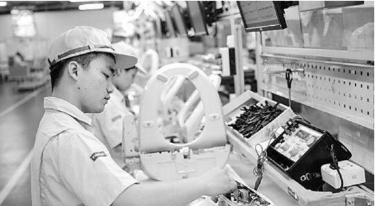 松下家电(中国)有限公司下属的松下家电厨卫空间事业部三楼生产车间内,同样有一排排忙碌的机器人,正在检测着刚生产出来的智能马桶盖。一旁,工人们在生产线上有条不紊地操作着。