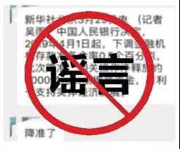 网传的消息称:“中国人民银行决定,2019年4月1日起,下调金融机构存款准备金率0.5个百分点……”因该谣言假借记者署名,许多人信以为真,引起广泛传播。