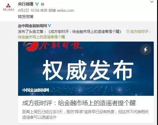 4月2日,中国人民银行办公厅官方微博转载了中国金融新闻网的评论文章《成方街时评:给金融市场上的造谣者提个醒》,文章称央行已就此事正式致函公安机关,请就此次编造发布虚假信息的行为依法进行查处。