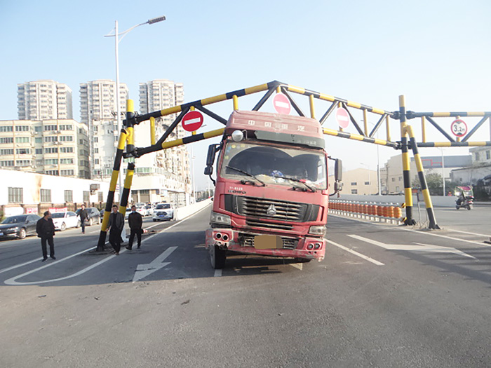 17日上午,鳌江四桥龙港下桥处发生一起单方事故。水泥罐车司机因过于自信,没有估准车的高度,未减速就往前开,不料车顶撞断了横梁,车子卡在横梁下动弹不得。交警与维修部门协作,及时消除一起道路交通安全隐患。