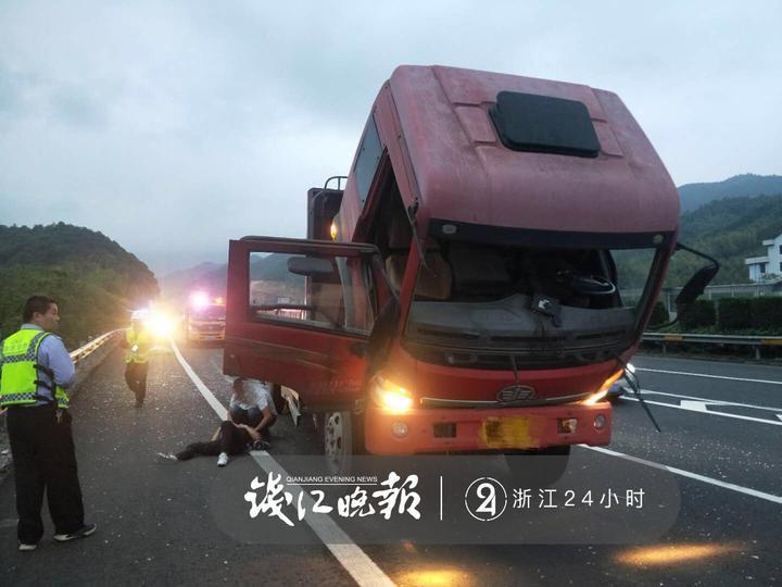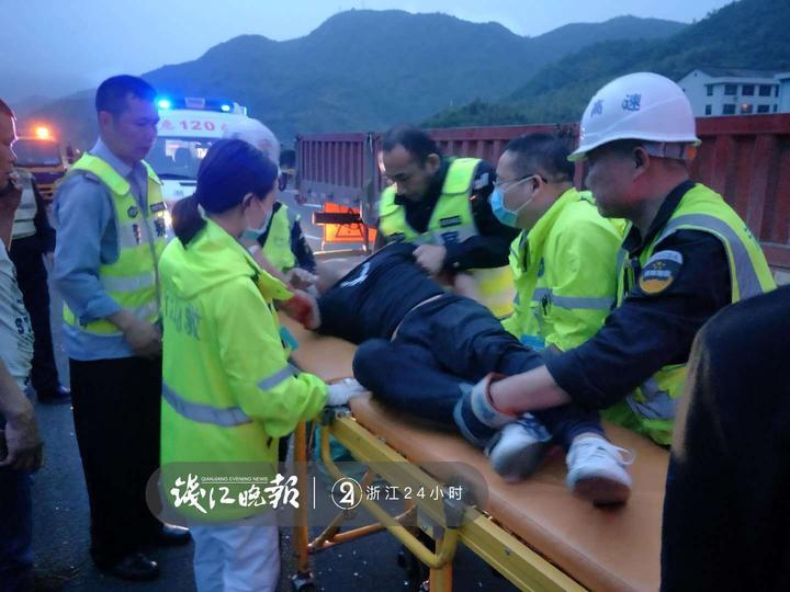4月22日18时30分,高速交警台州支队二大队获悉在台金高速公路往台州方向30公里处发生交通事故,立即赶到现场。发现有一辆重型普通货车停在主车道,货车车头向上抬起,挡风玻璃破碎,货车边上的硬路肩上躺着一个满脸鲜血的伤员。