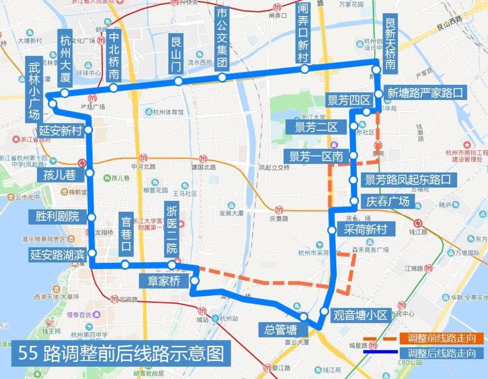 调整后的55路起始点不变,仍是武林小广场始发,循原线至新塘路,经昙花庵路、景昙路、庆春东路、秋涛北路、秋涛路、清江路、清泰立交桥、建国中路、解放路后再循原线至武林小广场。