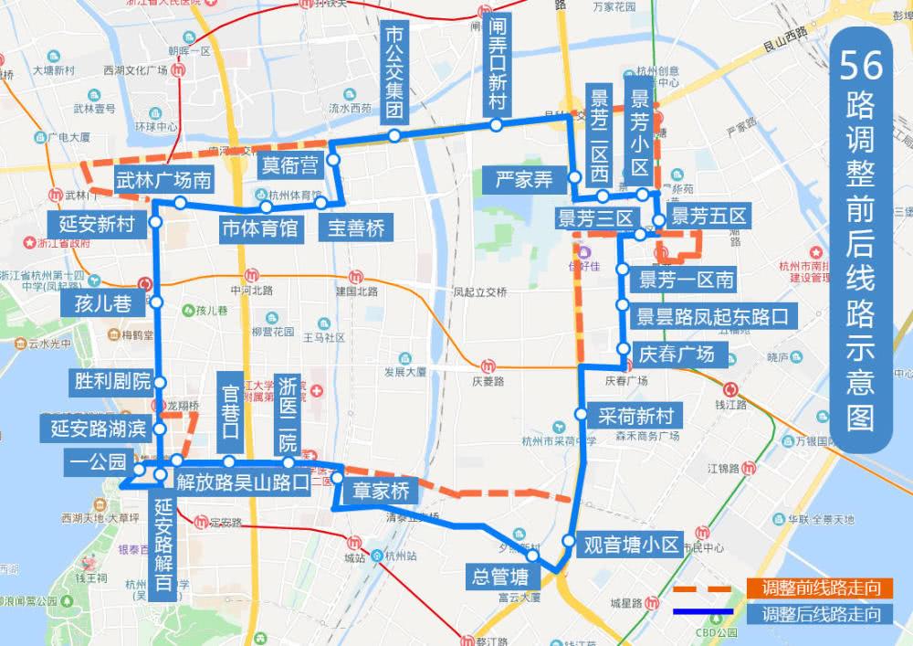 56路,调整为景芳小区至景芳小区。调整后,公交从景芳小区始发(原18路始发站),经昙花庵路、秋涛北路、艮秋立交桥、艮山西路、环城北路、建国北路、体育场路、延安路、将军路、南山路、解放路、建国中路、清泰立交桥、清江路、秋涛路、秋涛北路、庆春东路、景昙路、景芳路、新塘路、昙花庵路至景芳小区。沿途停靠景芳二区西、严家弄、闸弄口新村、市公交集团、莫衙营、宝善桥、市体育馆、武林广场南、延安新村、孩儿巷、胜利剧院、延安路湖滨、延安路解百、一公园、解放路吴山路口、官巷口、浙医二院、章家桥、总管塘、观音塘小区、采荷新村、庆春广场、景昙路凤起东路口、景芳一区南、景芳三区、景芳五区等26个单向停靠站,首末班时间为5:45-23:00。
