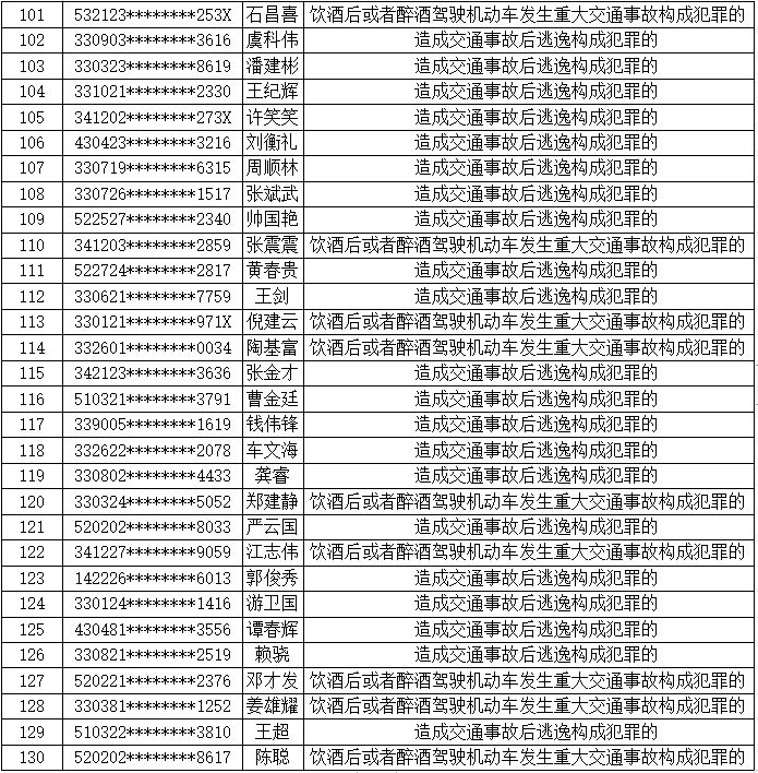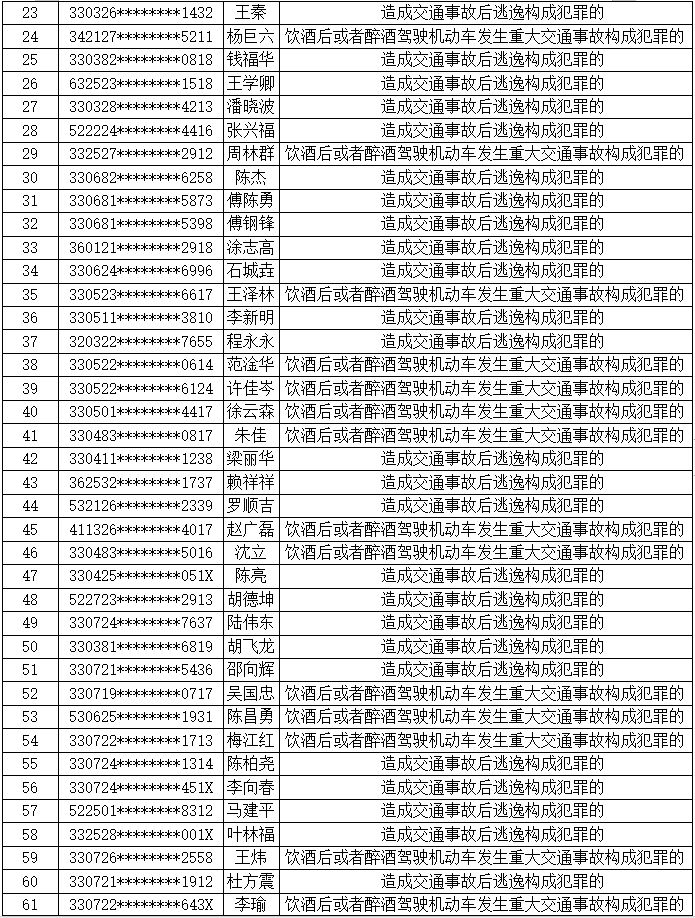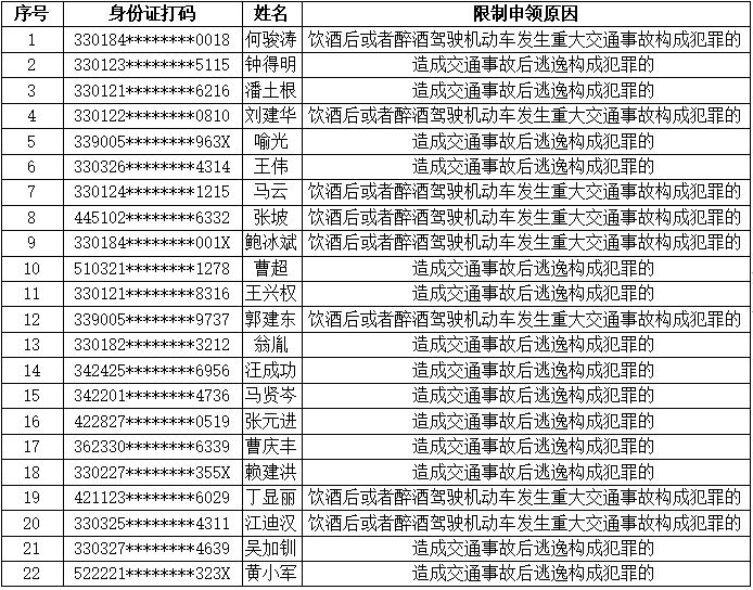 据浙江省公安厅通报,2018年,全省共682人被终生禁驾。2019年1-3月,130人终生禁驾(名单附后),禁驾原因主要是交通肇事逃逸或饮酒后造成重大事故。