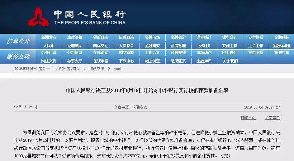 中国人民银行决定从2019年5月15日开始,对聚焦当地、服务县域的中小银行,实行较低的优惠存款准备金率。约有1000家县域农商行可以享受该项优惠政策,释放长期资金约2800亿元,全部用于发放民营和小微企业贷款。