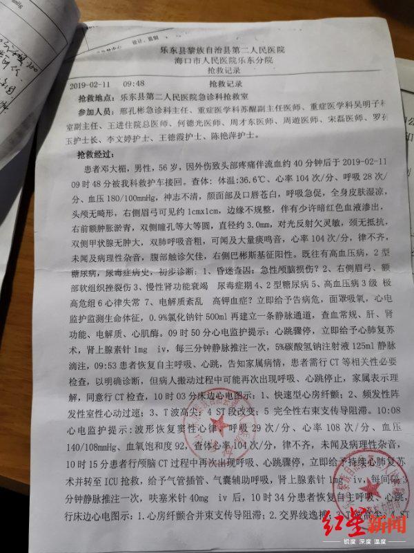 海口市人民医院乐东分院《抢救记录》显示,2月11日上午9时48分邓大楣被接至医院。抢救经过记载,当时邓大楣神志不清、颜面部及口唇苍白、呼吸急促,右侧眉弓可见1cmX1cm伤口,边缘不规整,伴有少许暗红色血液渗出,右前额肿胀淤青。