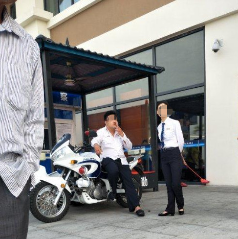 邓大楣晕倒在地,裴某璟坐在警用摩托车上吸烟