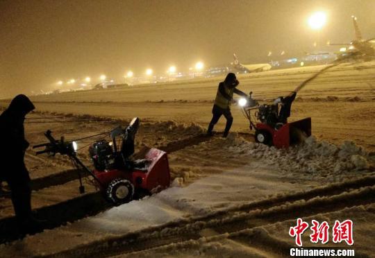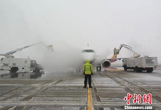 图为南昌昌北国际机场,工作人员正在机坪上进行除冰作业。 连三思 摄