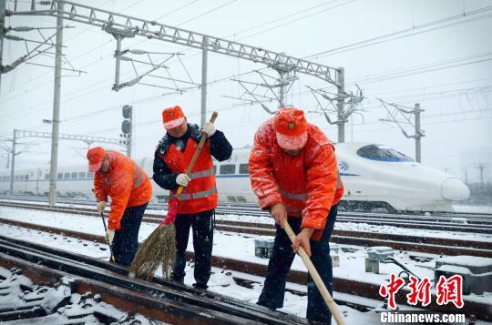南昌车站铁路工人对西站岔区和行车设备的积雪进行清扫,并涂抹防冻油,确保行车设备正常使用,全力确保铁路运输安全畅通。 周光辉 摄