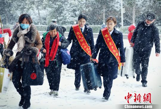12月30日,南昌车站党团员先锋队在南昌西站站前广场协助来往旅客进出站,帮助重点旅客提拿行李,保障旅客出行有序。 周光辉 摄