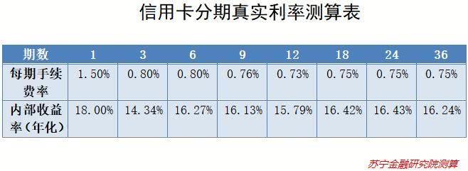 常见的月费率是按借款总额的0.75%,看起来年化总费率为0.75%×12 = 9%左右,似乎还可以接受。但是需要指出的是,这里的借款总额一直是按总本金计算,但是实际的借款本金却因为等额本息,随着时间的推移不断减少。所以分期还款的实际利息要远高于看起来9%的年化费率。下表展示了根据某银行的费率情况测算出来的真实利率值: