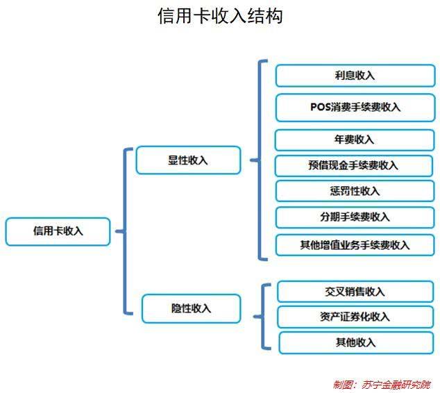 如图所示,信用卡的收入结构包括显性收入和隐性收入两个部分。其中,显性收入包含7个方面: