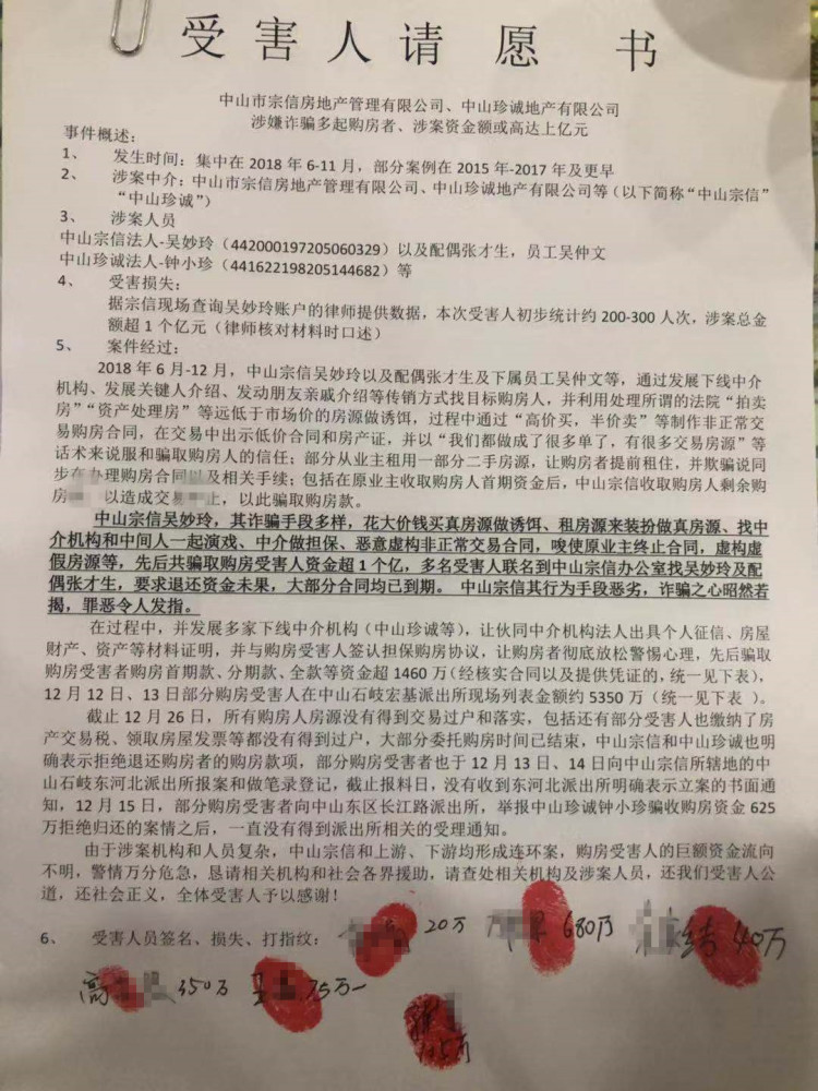 截至目前,据部分购房者爆料,中山市公安局石岐区分局已对“宗信”及其法人吴妙玲进行立案调查,吴妙玲已被正式拘捕并配合警方完成了口供录入;而中山市公安局东区分局长江路派出所也受理了对“珍诚”的报警。此外,“珍诚”法人钟某已收到了法院的三张传唤单,预计于明年初开庭审理此案。