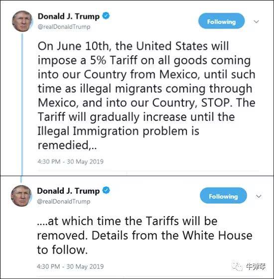 北京时间5月31日早晨,也就是当地时间5月30日晚上,特朗普突然在推特上宣布,从6月10日起,对所有墨西哥输美产品征收5%的关税。