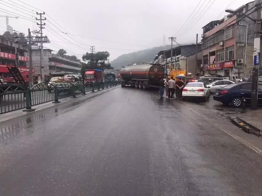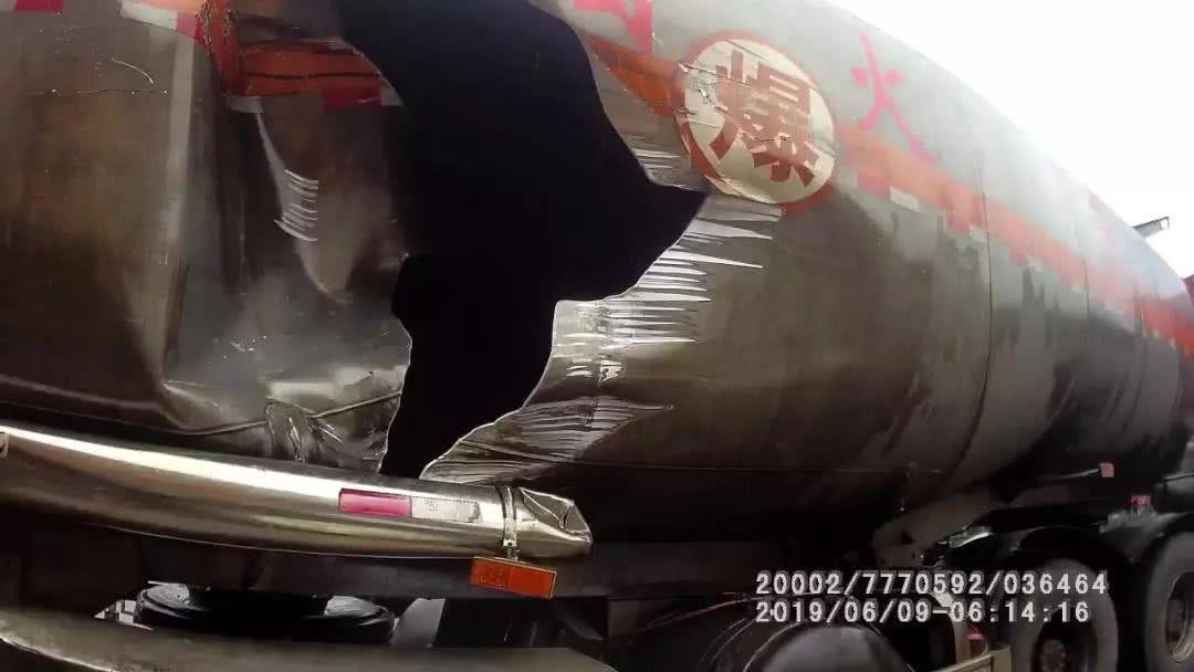 6月9日凌晨5时许,阴雨天气,道路湿滑,在104国道温州永嘉六岙村路口,一辆油罐车行驶中急刹车,结果导致失控,撞上了一辆停在路边的洒水车,所幸并无人员受伤。但油罐车罐体被撞破,里面的油倾流满地。