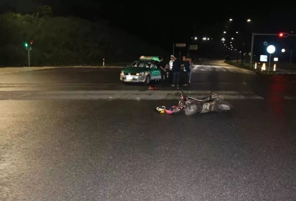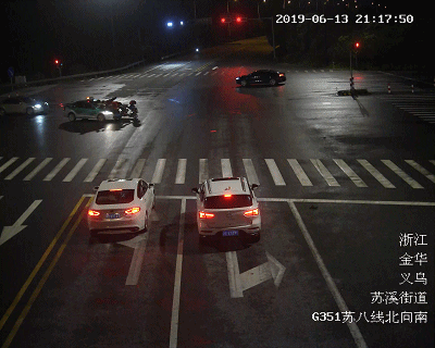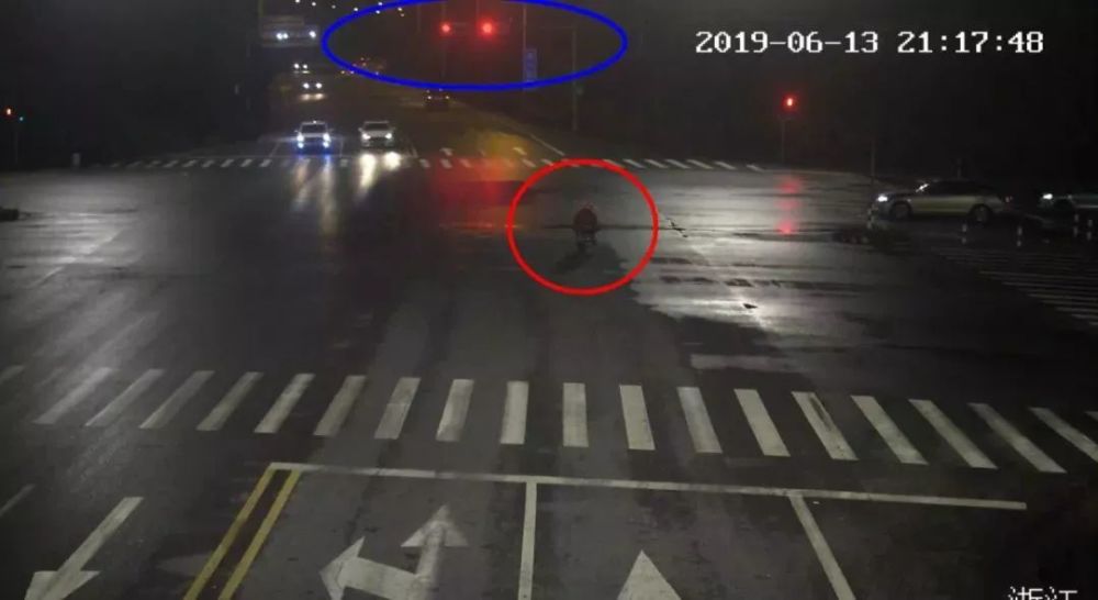 当天晚上9点17分许,义乌苏溪镇G351与苏八线交叉口,庞某骑着电动车,后座载着妻子,沿苏八线自南向北行驶至事发路口,无视前方红灯,径直穿过路口,与右侧沿G351自东向西正常绿灯行驶的出租车相撞。