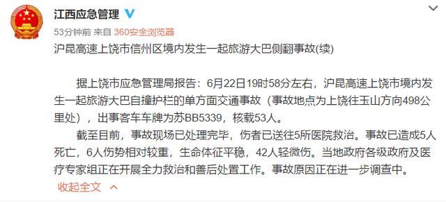 据上饶市应急管理局报告:6月22日19时58分左右,沪昆高速上饶市境内发生一起旅游大巴自撞护栏的单方面交通事故(事故地点为上饶往玉山方向498公里处),出事客车车牌为苏BB5339,核载53人。