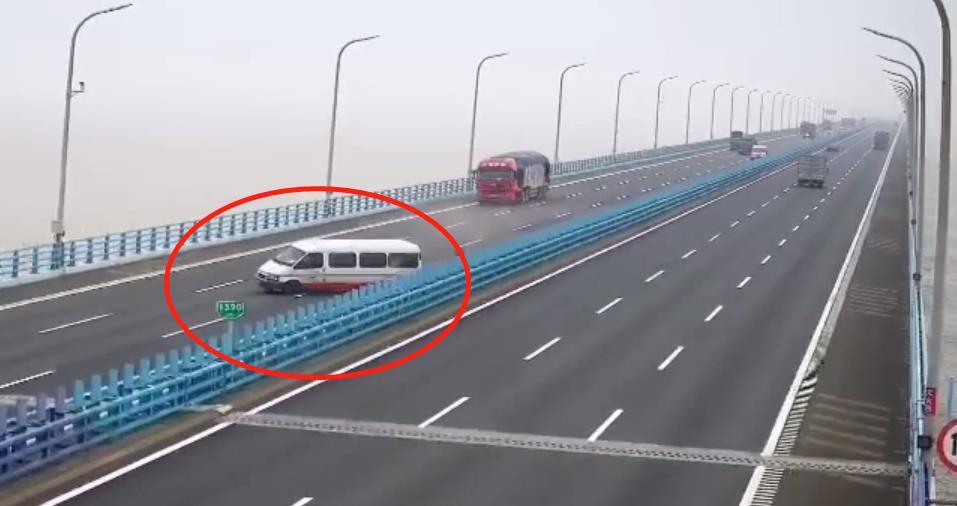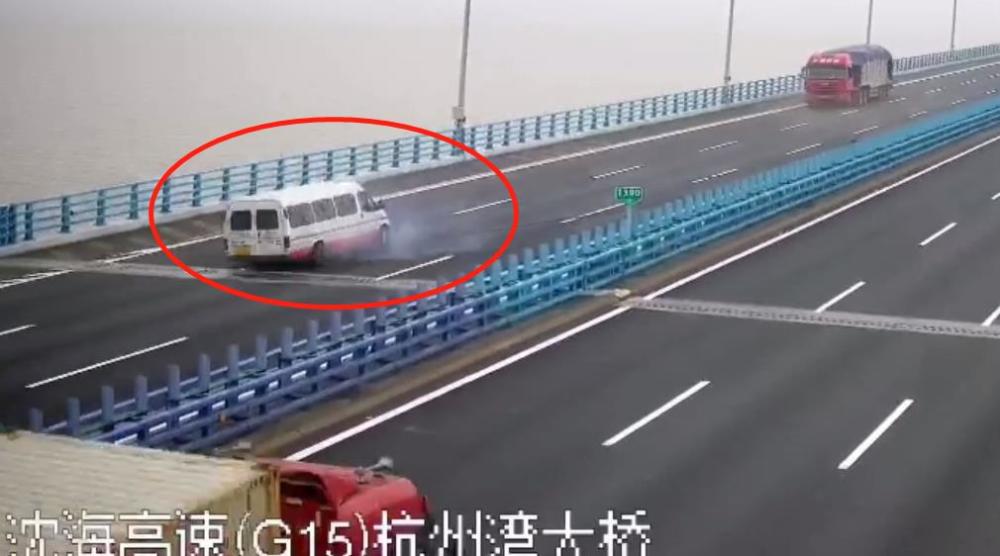 2019年7月17日6时57分,在杭州湾跨海大桥往宁波方向1389公里处,有一辆江铃全顺中型客车在第2车道正常行驶时,突然左后轮爆胎,轮胎与地面猛烈摩擦,车尾部冒起了一阵尘烟,随后车辆重心失控,在跨海大桥上来了一个360度大旋转,幸好被大桥边护栏截停在应急车道内。车上12人安然无恙。