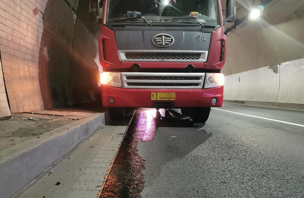 当晚21时29分许,台州高速交警巡逻至诸永高速温州方向123公里处的大陈隧道时,一辆浙J号大型货车抛锚在主车道,右侧轮胎紧紧的卡在了隧道的检修道边缘,车身底部的传动轴也掉了下来,车辆机油也漏了,铺在了路面。