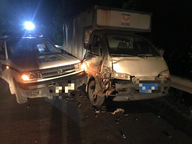 7月30日23时许,矾山交警中队民警黄文化等人正在浙闽交界处矾山镇甘岗线0公里+300米处公路设卡执勤,并对过往车辆进行检查。此时司机翁某驾驶货车从灵溪开往福鼎方向,因无运输液化石油气罐证件,车内载有66瓶空的液化煤气罐,害怕被检查,急匆匆驾驶轻型箱式货车冲卡,造成交警警车损坏。