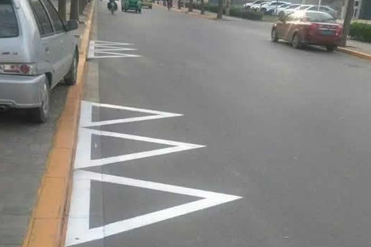三角标线是最近才出现的,之前在马路上一直都没有。三角标线对应的就是三分钟停车位了,三分钟停车位的意思就是,这个车位你可以停车,但是只能有3分钟的时间,就是属于上下车的车位,之后就要开走。