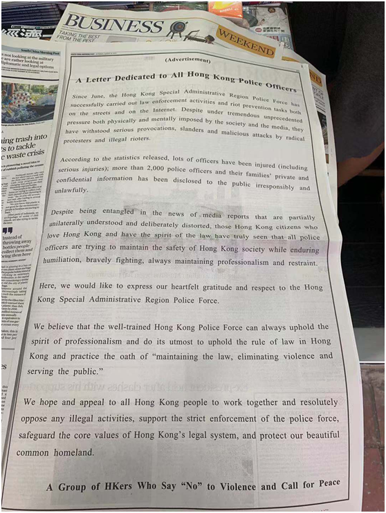 同时,继《星岛日报》8日以头版整版广告的方式刊登香港市民公开信《支持香港警察 维护社会安宁》后,《明报》《信报》刊登今日该文,支持香港警方“严正执法”。文中指出香港警察无惧自身安危,身陷险境却坚持严正执法。面对非理性的暴力针对,香港警队一直秉持极高的事业操守,忍辱负重,无怨无悔地维持著社会秩序。