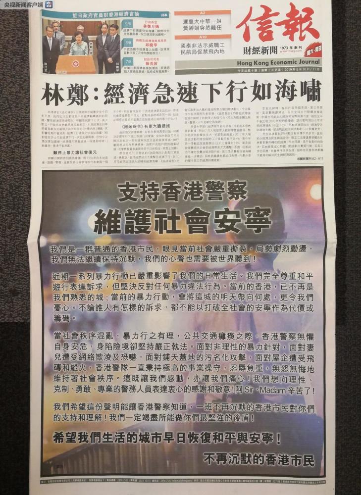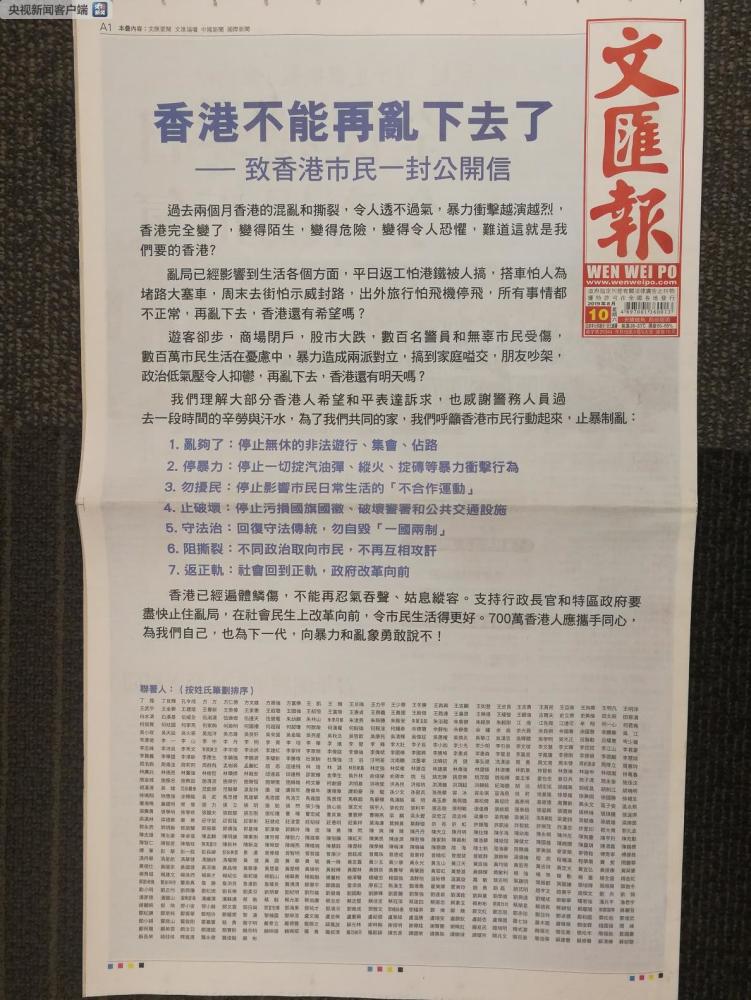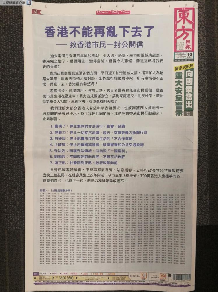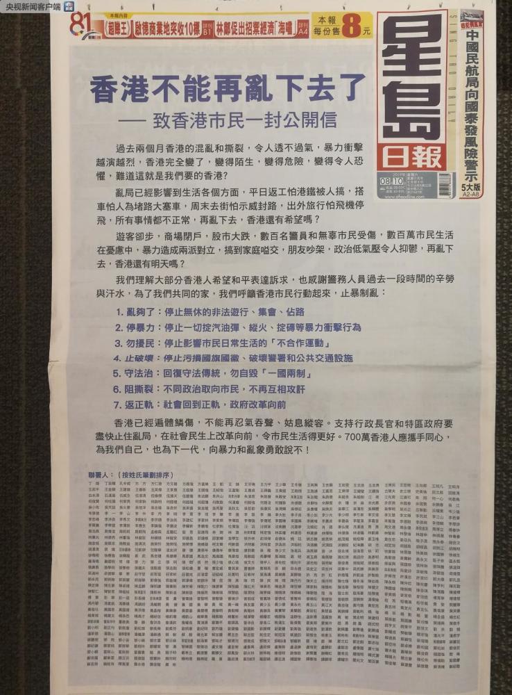 8月10日,香港《大公报》《南华早报》《文汇报》等多家媒体在头版位置刊登了香港各界人士联署的《香港不能再乱下去了》整版广告,支持香港警察严格执法,维护社会安宁。文中指出,目前香港的乱局已经影响到生活的各个方面,游客却步,商场关闭,股市大跌。同时呼吁香港市民行动起来,止暴制乱,停止非法游行、集会、占路;停止暴力,停止影响市民日常生活的不合作运动;停止污损国旗国徽、破坏警署和公共交通设施;回归守法传统,维护一国两制;弥合社会撕裂,让社会早日回到正轨。700万香港人应该携手同心,向暴力和乱象勇敢说不。(央视记者 王悦舟)