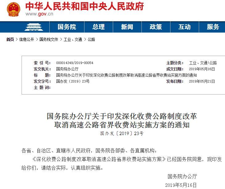 《深化收费公路制度改革取消高速公路省界收费站实施方案》