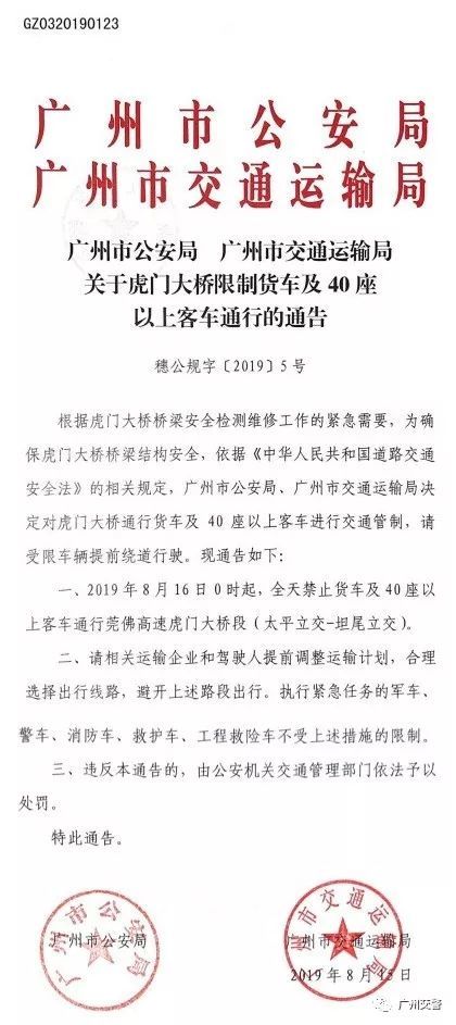 一、2019年8月16日0时起,全天禁止货车及40座以上客车通行莞佛高速虎门大桥段(太平立交-坦尾立交)。