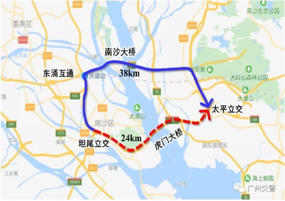 3、佛山、顺德方向需往东莞、深圳的车辆,可行驶南二环高速—南沙大桥—广深沿江高速(或广龙高速—广深高速)往东莞、深圳。