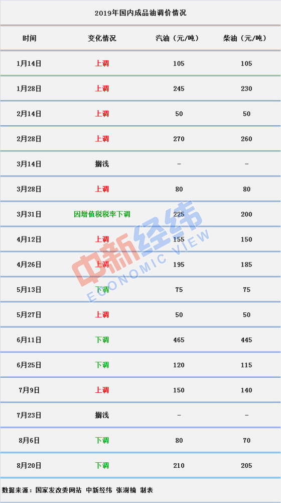 中新经纬客户端统计,2019年以来,按照“十个工作日”一调整原则,包括3月31日因增值税税率调整而进行的下调,国内成品油价已历经17轮调价,呈现“9升6降2搁浅”格局,汽、柴油价格分别累计上调125元/吨和140元/吨。