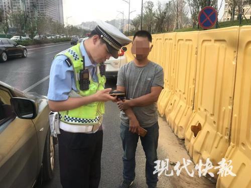 图为交警查处男子无证驾驶现场。交警供图