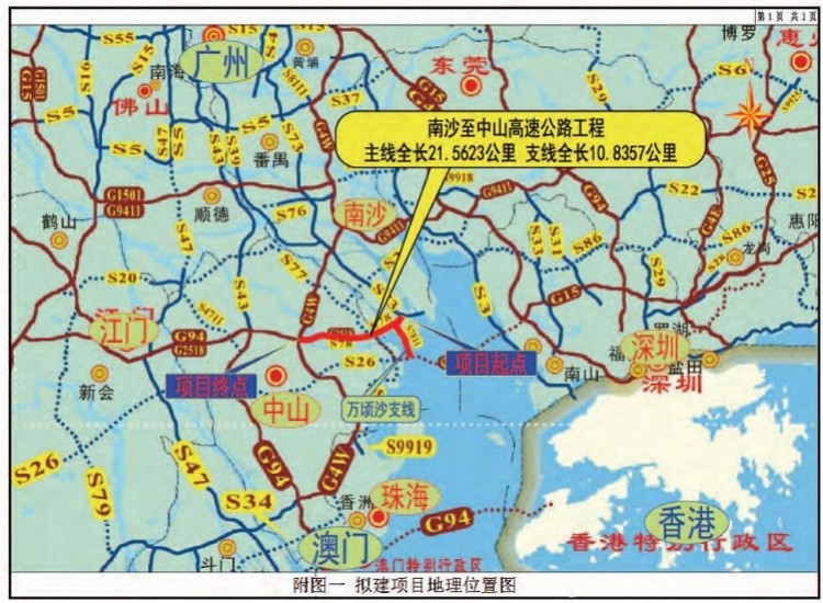 《环评报告书》显示,拟建的南沙至中山高速公路项目位于广州市南沙区南部和中山市西部,途经广州市南沙区、中山市港口镇、民众镇、火炬开发区,包括南沙至中山高速公路主线、万顷沙支线两部分。