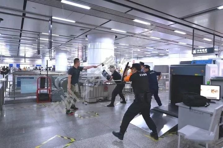 很快地铁警方发现两名嫌疑人携包出高铁后从地铁E口进站,当他们过安检时,安检队员通过安检机发现包内藏有刀斧等物品,在准备进行人工复检时,同时通报站内民警,两名嫌疑人与安检人员发生口头纠纷,进而嫌疑人进入安检通道直接至安检机内抢过背包后,对围观群众发起攻击。