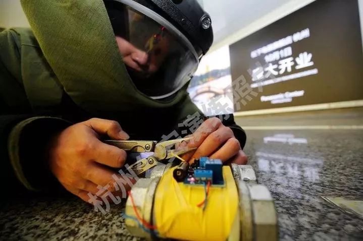 此时,龙翔桥站传来消息,第三名嫌疑人疑似出现。很快地铁分局一组民警在站厅搜寻过程中,发现一可疑物,经搜爆犬对可疑物进行甄别初步确认为可疑爆炸物,并将疑似爆炸物用防爆毯覆盖,请求特警专业力量支援。特警排爆队赶到后成功拆除疑似爆炸物,同时上城分局也在龙翔桥站D口外将嫌疑人抓获。