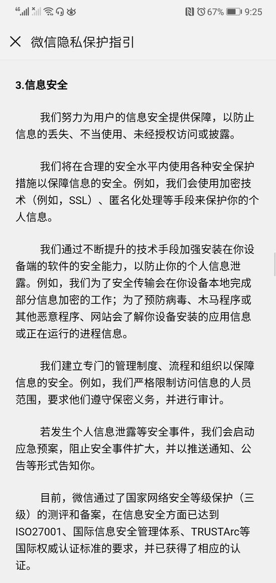 新京报记者查阅《微信隐私保护指引》发现,其“信息安全”一栏中表示“我们将在安全水平内使用各种安全保护措施以保障信息的安全。例如,我们会使用加密技术(例如,SSL)、匿名化处理等手段来保护你的个人信息。”