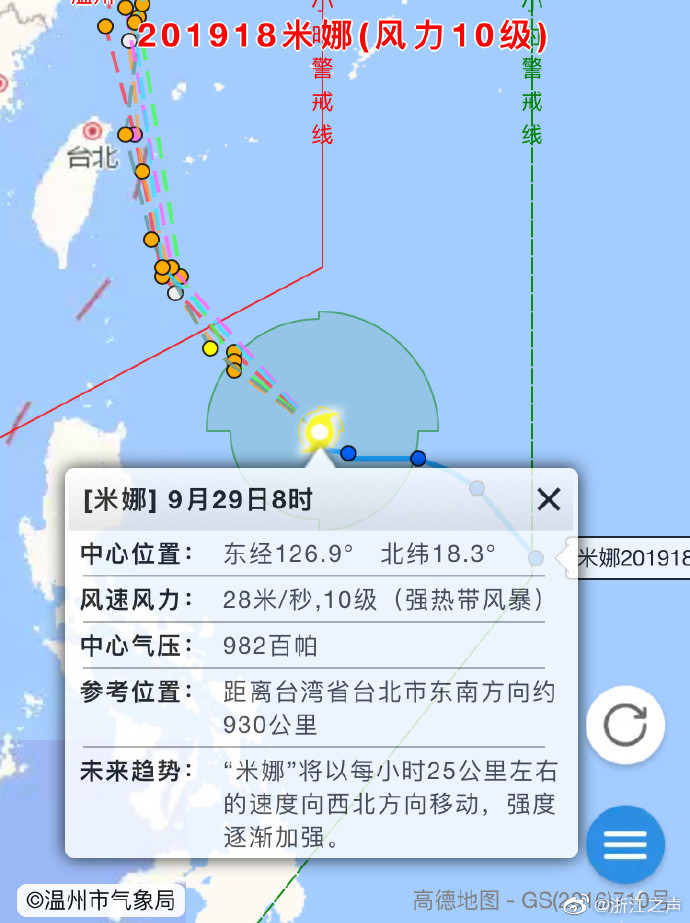 据温州气象部门报告,受今年第18号台风“米娜”(强热带风暴级)影响,30日至10月1日温州有一次明显的风雨影响过程;29日温州沿海海面风力6-7级阵风8级,傍晚起增强到7-9级,30日风力将继续增强至9-11级,30日夜里到10月1日风力将继续增强至11-13级。温州市气象部门已发布海上台风警报,根据《温州市防汛防台抗旱应急预案》规定,温州
