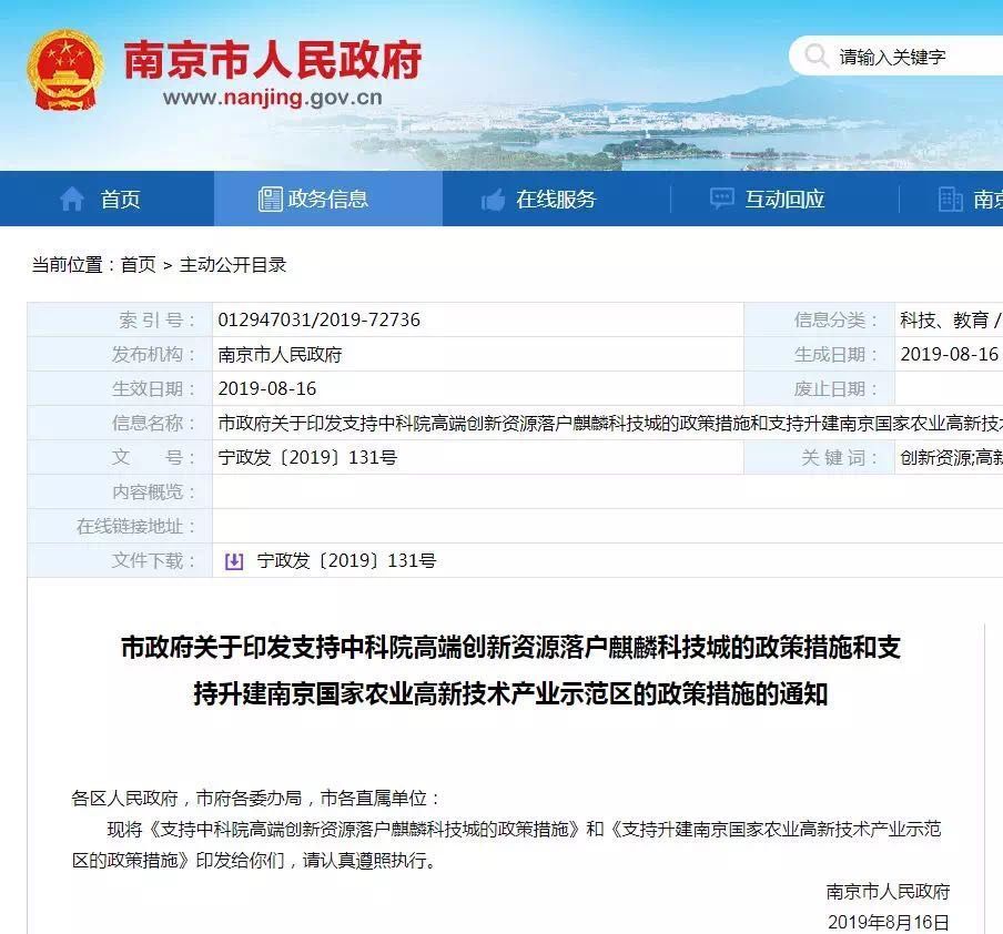 近日,南京市人民政府发布了《支持中科院高端创新资源落户麒麟科技城的政策措施》、《支持升建南京国家农业高新技术产业示范区的政策措施》。