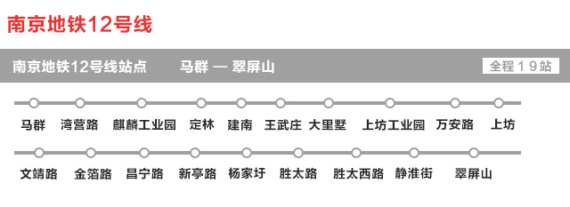 南京地铁12号线是南京地铁线网中一条东北至西南走向的线路,根据百度百科查询到,沿线车站有19个,分别是马群、湾营路、麒麟工业园、定林、建南、王武庄、大里墅、上坊工业园、万安路、上坊、文靖路、金箔路、昌宁路、新亭路、杨家圩、胜太路、胜太西路、静淮街、正德学院。