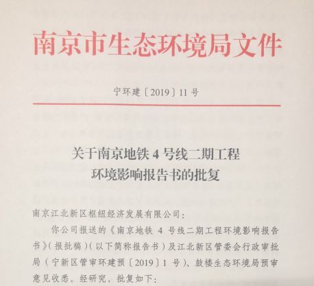 南京市生态环境局近日对南京地铁4号线二期工程环境影响报告进行批复。