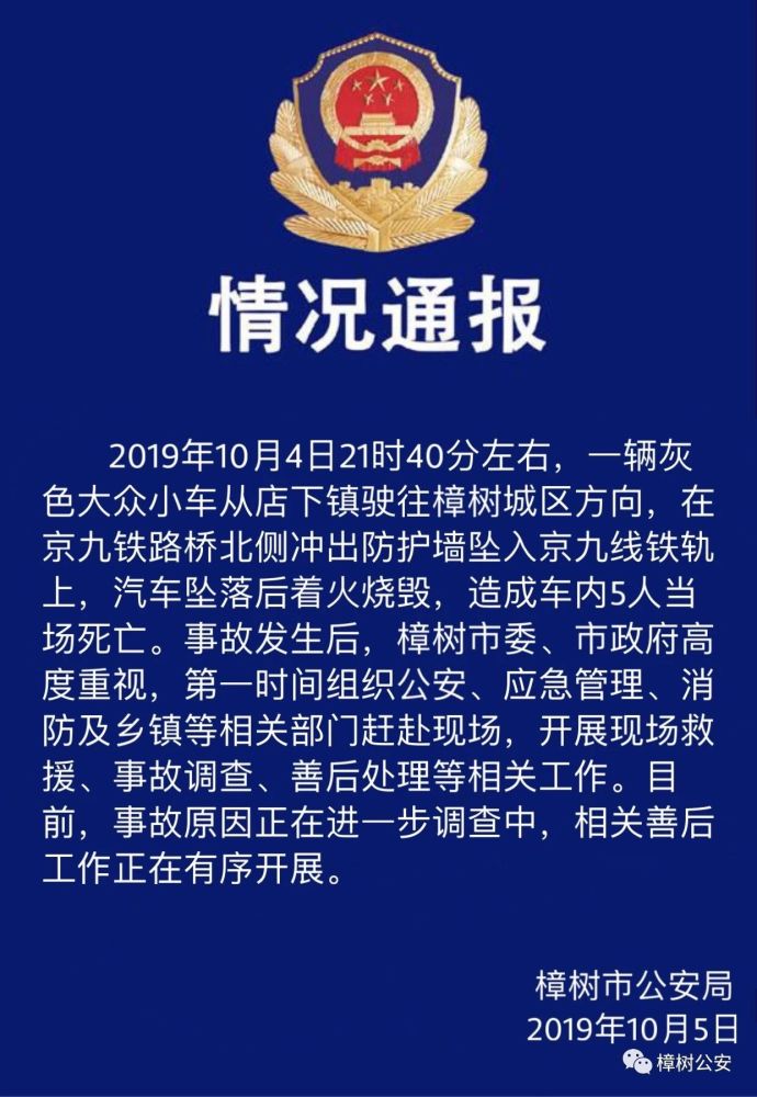 据樟树市公安通报,10月4日,一辆灰色大众小车从店下镇驶往樟树城区方向,在京九铁路桥北侧冲出防护墙坠入京九铁轨上,汽车坠落后着火烧毁,造成车内5人当场死亡。以下为关于此事通报全文: