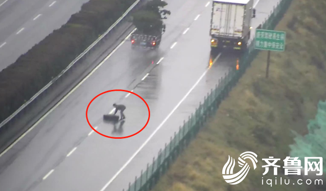 就在巡逻民警还未到达现场处置的时候,视频中显示一辆货车紧急刹车停在了轮胎前边的应急车道上,随即车上下来两名司机,全然不顾后方高速行驶的车辆,其中一名司机跑到路中间,使出浑身力气拖动轮胎,偌大的轮胎被该名司机“征服”。随后两人合伙把轮胎滚动到自己车下并抬到货车上,之后扬长而去。