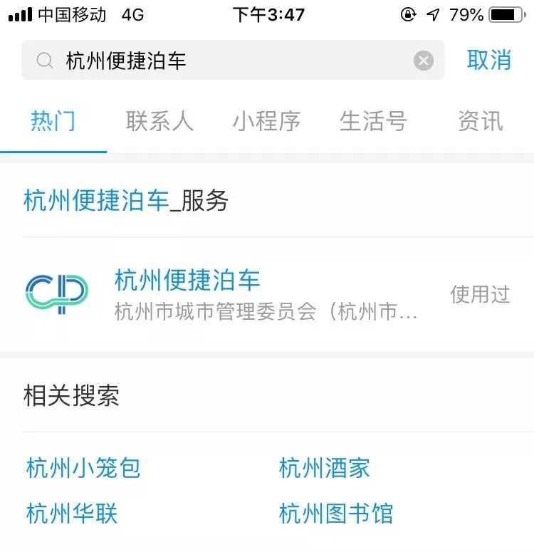 打开支付宝并搜索“杭州便捷泊车”。